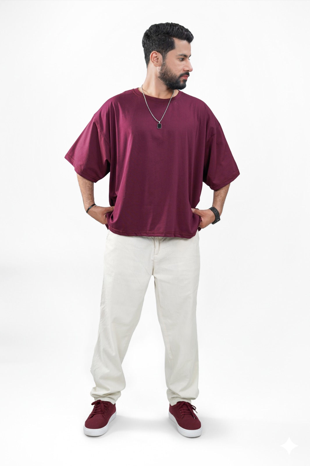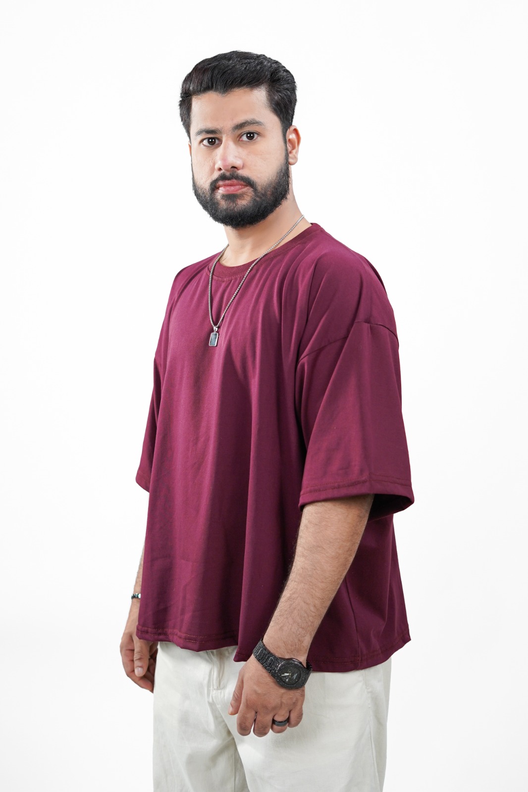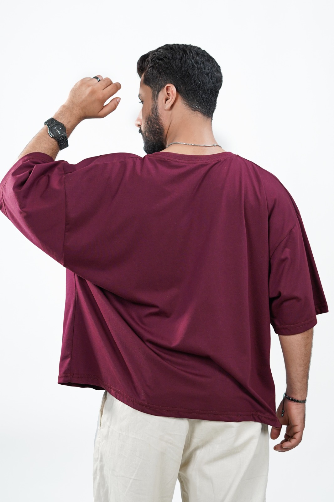 Crafted from premium jersey fabric, this maroon oversized tee delivers a street fit silhouette with a soft, smooth texture for all-day comfort. Designed for a clean, modern streetwear look, it’s perfect for those who value both style and ease in everyday wear.